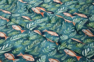 Yaz Koleksiyonu Suluboya Efektli Denizaltı Yaşamı Yeşil Zeminli Turuncu Balıklar Çok Amaçlı Dekoratif Dijital Baskı Kumaş