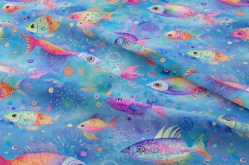 Yaz Koleksiyonu Suluboya Efektli Geometrik Denizaltı Yaşamı Gökkuşağı Balıklar Çok Amaçlı Dekoratif Dijital Baskı Kumaş
